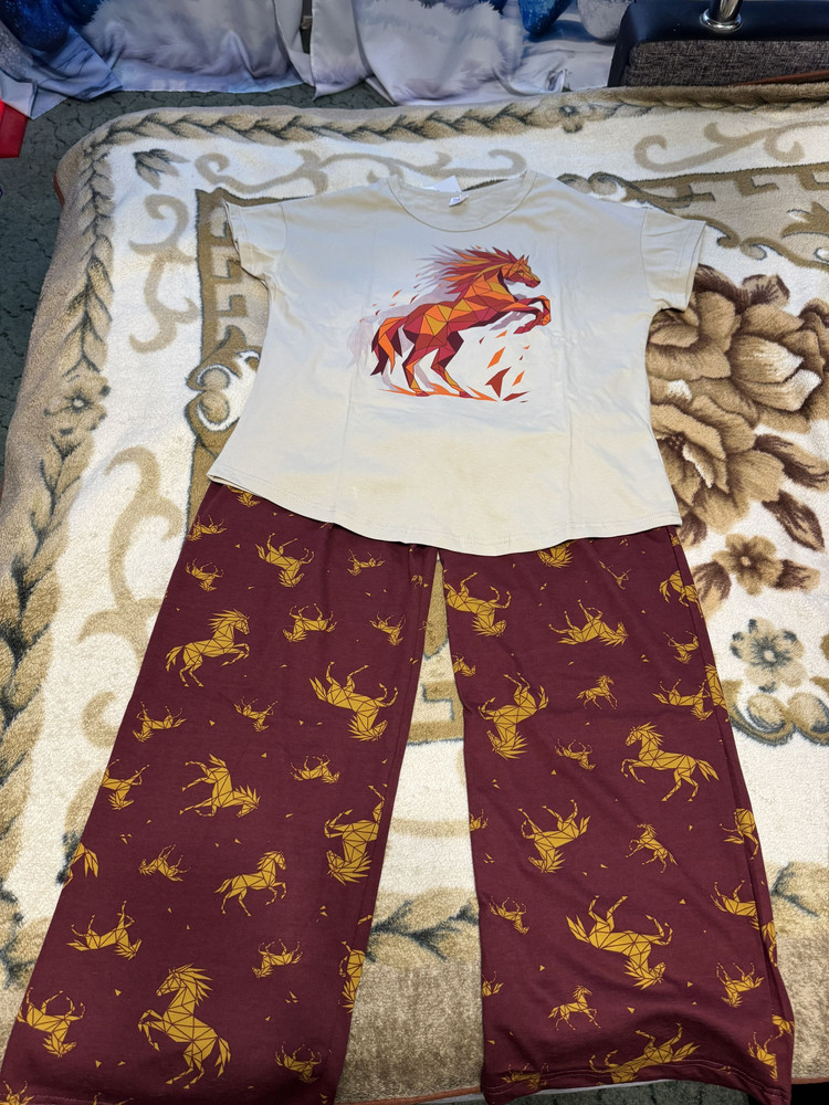 Женская новогодняя пижама с Лошадью — символом 2026 года сочетает уют, стиль и праздничное настроение. Модель выполнена из мягкого трикотажа 100% хлопок плотностью 160 г/м², который дышит, приятно ощущается на коже и не вызывает раздражений, поэтому подходит для ежедневного отдыха и сна. Верх комплекта — свободная однотонная футболка с ярким принтом Лошади. Современная графика подчёркивает новогоднюю тематику, а спущенный рукав и круглая горловина с аккуратной окантовкой делают посадку комфортной и расслабленной. Футболка не стесняет движений и легко садится по фигуре благодаря свободному силуэту. Штаны выполнены из трикотажа с набивным рисунком лошадей, который создаёт выразительный праздничный образ. Фасон — широкий, свободный, идеально подходящий для сна и домашних дел. В боковых швах находятся удобные карманы, добавляющие практичности. Особое внимание привлекает широкий простроченный пояс, мягко фиксирующий посадку и не вызывающий дискомфорта. Пижама прекрасно подходит для уютных семейных вечеров, подарков и новогодних фотосессий. Она является частью коллекции Family Look, что позволяет собрать гармоничный комплект для всей семьи в едином стиле. Мягкая, лёгкая и праздничная, эта пижама подарит комфорт и создаст настроение зимнего уюта.
